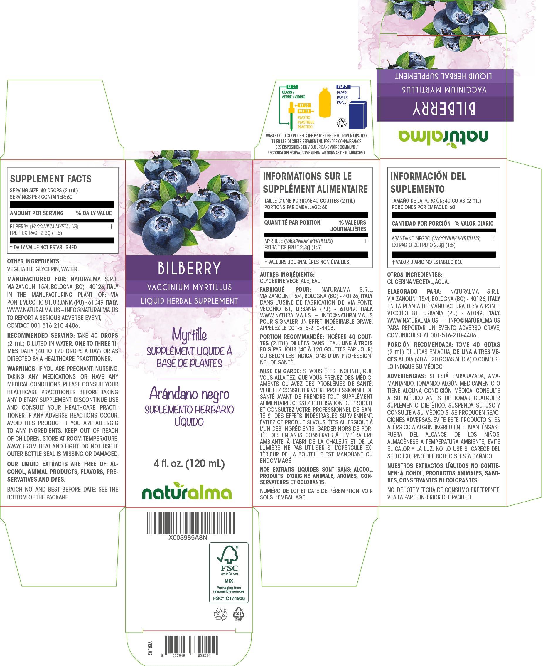 - Bilberry or European blueberry (Vaccinium myrtillus) fruit liquid extract or tincture concentrated 1:5. 100% natural, alcohol and sugar free. MADE IN ITALY.