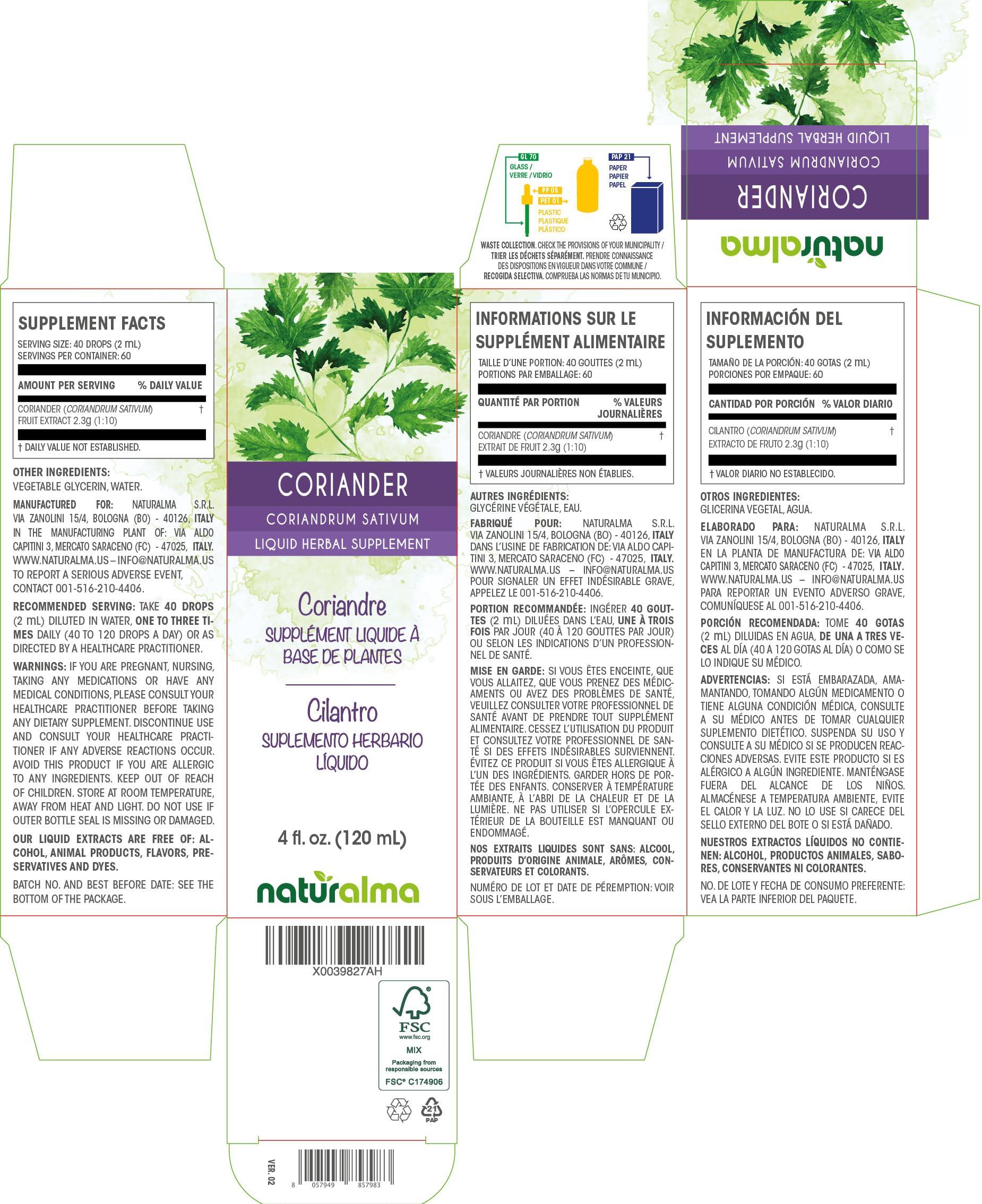 - A NATURAL AID: Coriander or Cilantro liquid herbal supplement in drops. 40 drops (2 ml) contain 2.3 g of Coriander or Cilantro extract (1:10). Glyceric macerate or pure fluid extract of Coriander or Cilantro (Coriandrum sativum) fruit in drops.