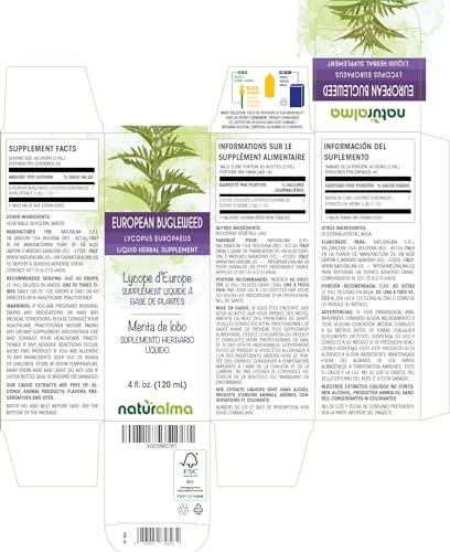 Details: European bugleweed or Gypsywort (Lycopus europaeus) herb Liquid herbal supplement in drops, consisting of a concentrated liquid extract (tincture 1:10), highly pure and 100% natural. All NATURALMA liquid extract or tinctures are made using an exclusive extraction method, which allows to obtain the maximum concentration of active ingredients. They are 100% alcohol-free and totally natural. Pleasant-tasting and without added sugar. Our herbal supplement are produced and packaged in Italy. Our liquid extract are free of: Alcohol, Animal products, Flavors, Preservatives and Colors. Glycerine is a 100% natural, plant-based and low calorie sweetener. Glyceric macerate or pure fluid extract of European bugleweed or Gypsywort (Lycopus europaeus) herb in drops.