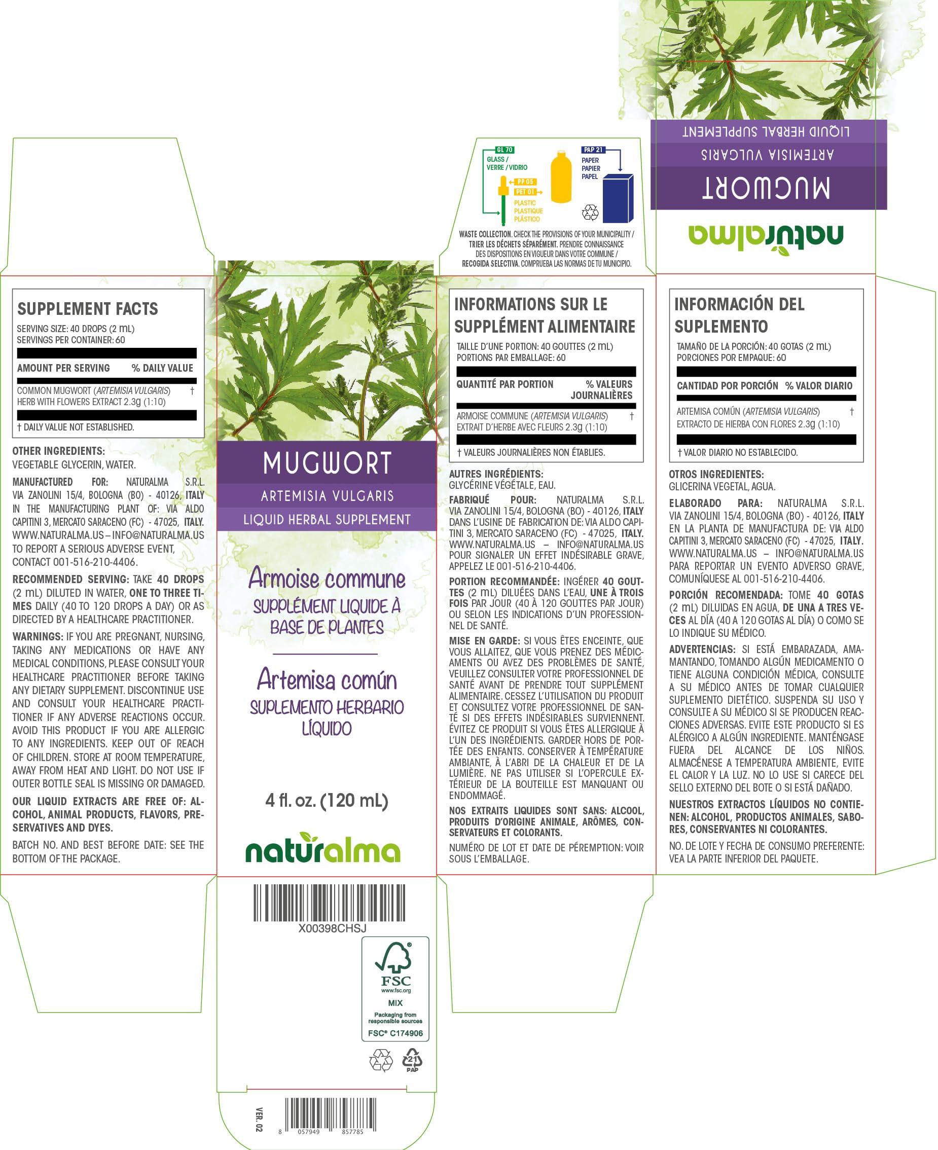 - Mugwort (Artemisia vulgaris) herb with flowers liquid extract or tincture concentrated 1:10. 100% natural, alcohol and sugar free. MADE IN ITALY.