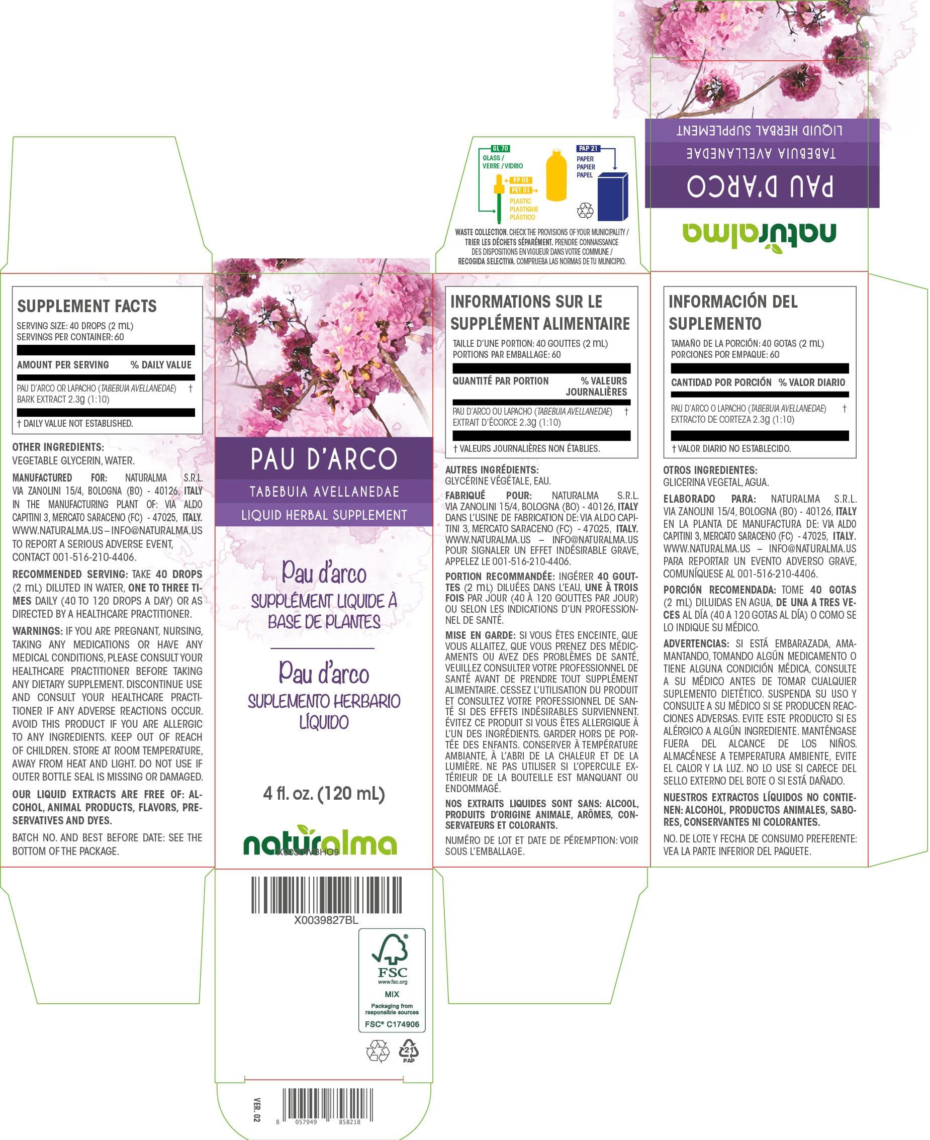 - Pau d'arco or Lapacho (Tabebuia avellanedae or Tecoma curialis) bark liquid extract or tincture concentrated 1:10. 100% natural, alcohol and sugar free. MADE IN ITALY.